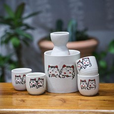 Lim401 복고양이 소주잔 사케잔 도쿠리 선물세트 마네키네코 (국내당일발송), 6P(잔4+술병1+워머1), 1세트