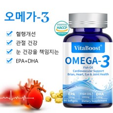오메가3 오일 생선유 DHA EPA 1000mg 피쉬 소프트젤 혈행혈중개선 건조한 눈 개선 기억력 개선 뼈 관절 건강 캡슐, 2개, 60정